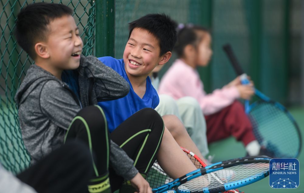 ↑在湖北省京山市文峰公园网球场,教练指导孩子们打网球(2024年3月21日摄)。新华社记者 杜子璇 摄