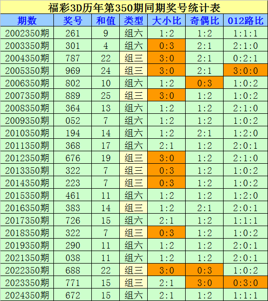 组选类型判断:在第350期历史同期开奖中,组六开出12次,组三开出10次,今年同期看好开出组六号码。