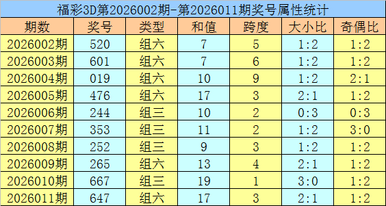 开奖回顾:福彩3D第2026011期开出奖号647。奖号形态为组六,奇偶比为1:2,012路比为1:2:0,大小比为2:1,和值为17,跨度为3。
