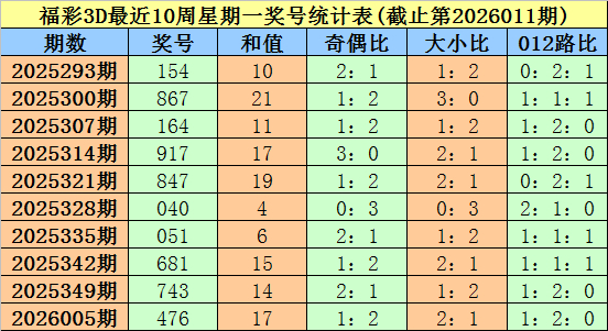 福彩3D第2026005期(上周星期一)奖号为476。其中奖号奇偶比为1:2,大小比为2:1,012路比为1:2:0。