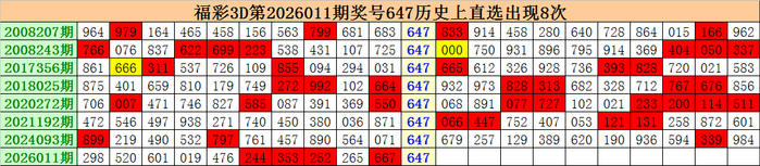 上期回顾:福彩3D第2026011期开出奖号647。